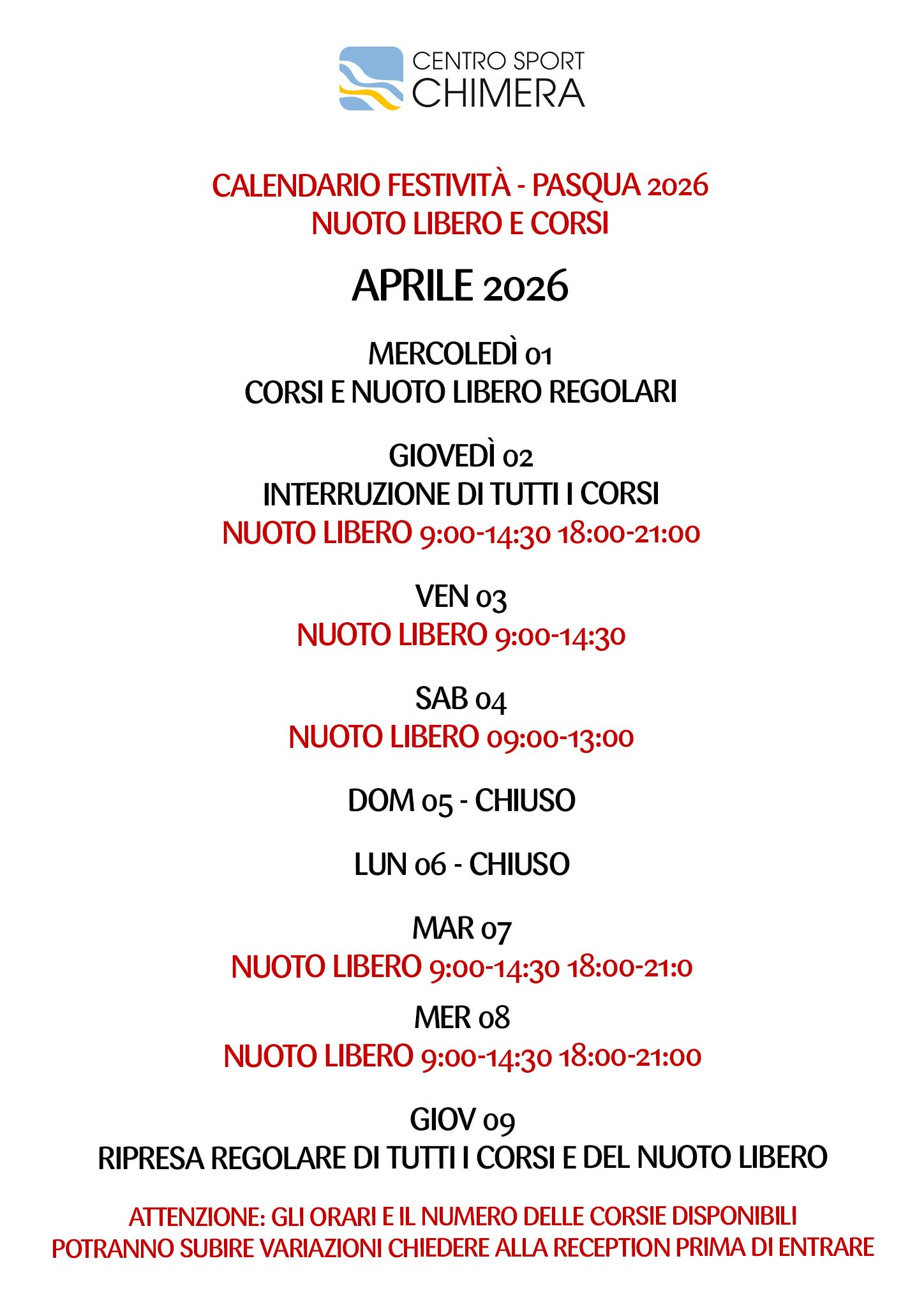 In occasione di Pasqua 2026 gli orari potrebbero subire variazioni.